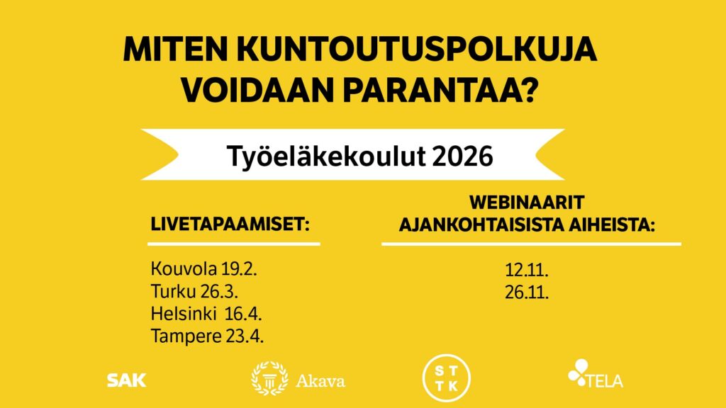 Työeläkekoulut ovat maksuttomia livetilaisuuksia, joita ei striimata tai tallenneta. Käymme läpi työhönpaluun mahdollistamisen keinoja, työeläkekuntoutuksen polkua ja työeläketurvan kehittämisen ajankohtaisia kysymyksiä. Tilaisuuksissa ovat puhumassa palkansaajakeskusjärjestöjen, Työeläkevakuuttajat Telan ja työeläkeyhtiöiden asiantuntijat.