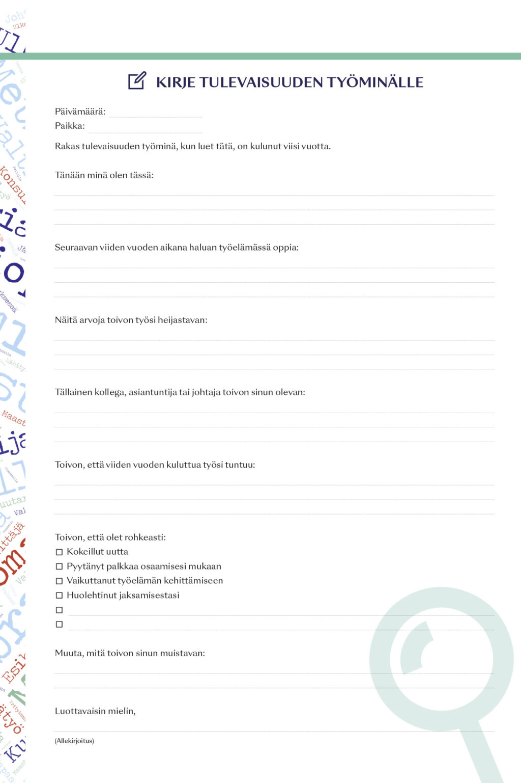 Seuraavan sivun kirjepohjaan voit kirjoittaa ajatuksia, toiveita ja unelmia. Leikkaa sivu talteen ja palaa siihen viiden vuoden kuluttua. Silloin näet, etenikö matkasi kuten suunnittelit.