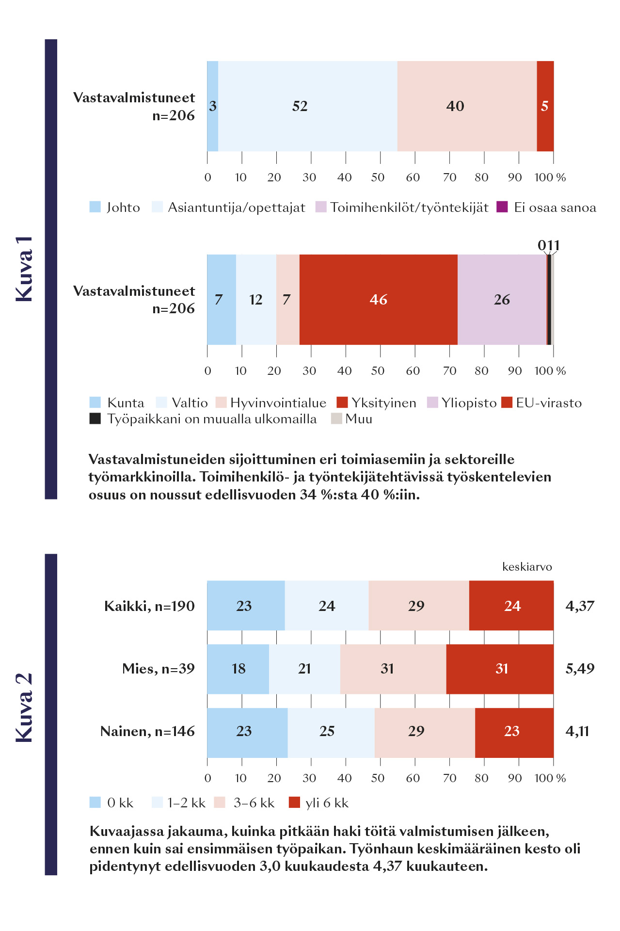 Valmistumisen jälkeen 68 % oli saanut työpaikan, kun taas 32 % ei. Työnhaun kesto on pidentynyt edellisvuoden keskimääräisestä 3 kuukaudesta lähes 4,5 kuukauteen (kuva 2). Yllättäen ensimmäinen työpaikka oli löytynyt useimmiten avoimen haun kautta, kun aiemmin tavallisin reitti oli jatkaa opiskeluaikaisessa työssä. Työttömien toimeentulo oli pääsääntöisesti työmarkkinatuki tai Kelan peruspäiväraha (46 % vastanneista), ansiosidonnaista työttömyyspäivärahaa oli saanut joka kolmas (32 %).