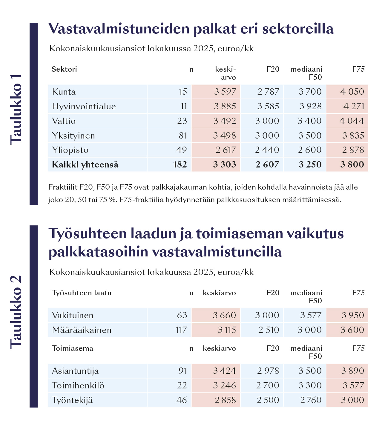 Vastavalmistuneiden keskipalkka oli 3 303 € lokakuussa 2025 (taulukko 1). Palkkataso vaihteli selvästi sektorien ja toimiasemien välillä: yksityisellä ja valtiosektorilla keskimääräiset ansiotasot (noin 3 500 €) olivat lähellä toisiaan, korkeimmat palkkatasot olivat kunnissa ja hyvinvointialueilla. Yliopistoissa taas väitöskirjatutkijoiden palkkatasot eriytyvät yhä kauemmas muista sektoreista keskimääräisen palkan ollessa lokakuussa 2 617 €. Kun verrataan kuuden vuoden takaisiin työmarkkinatutkimuksen tuloksiin, yliopistoissa vastavalmistuneiden palkkataso on kehittynyt hitaammin, vajaa 8 % vuodesta 2019, kun valtiolla kehitystä on tullut samassa ajassa 11 %.