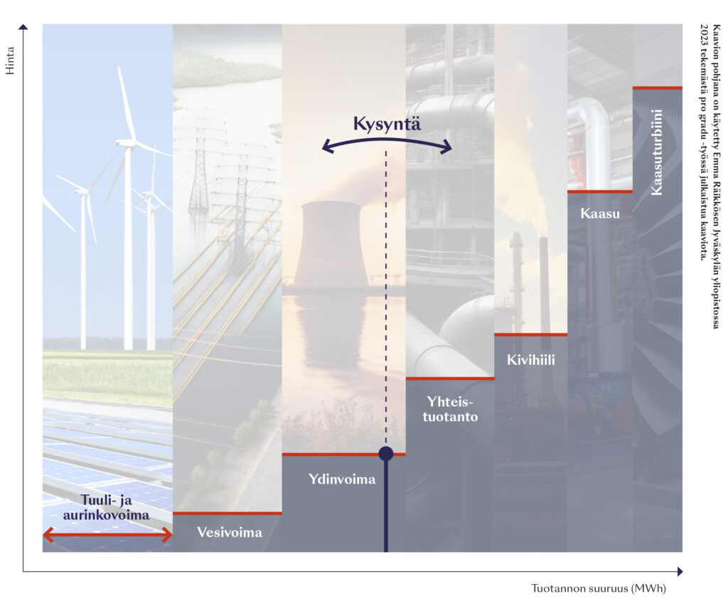 Sähkön hinta määräytyy kunakin ajanhetkenä tarvittavan kalleimman tuotantomuodon mukaan eli siinä kohdassa, johon kysyntää kuvaava viiva asettuu x-akselilla. Kaavion oikeassa laidassa kaasuturbiinilla tuotettava sähkö on jo todella kallista, ja sillä 15 minuutin ajanjaksolla, jonka kysyntää indikoiva viiva on sen kohdalla, kaikki ostettu sähkö – myös halvemmalla tuotettu – maksaa pörssissä sen verran.