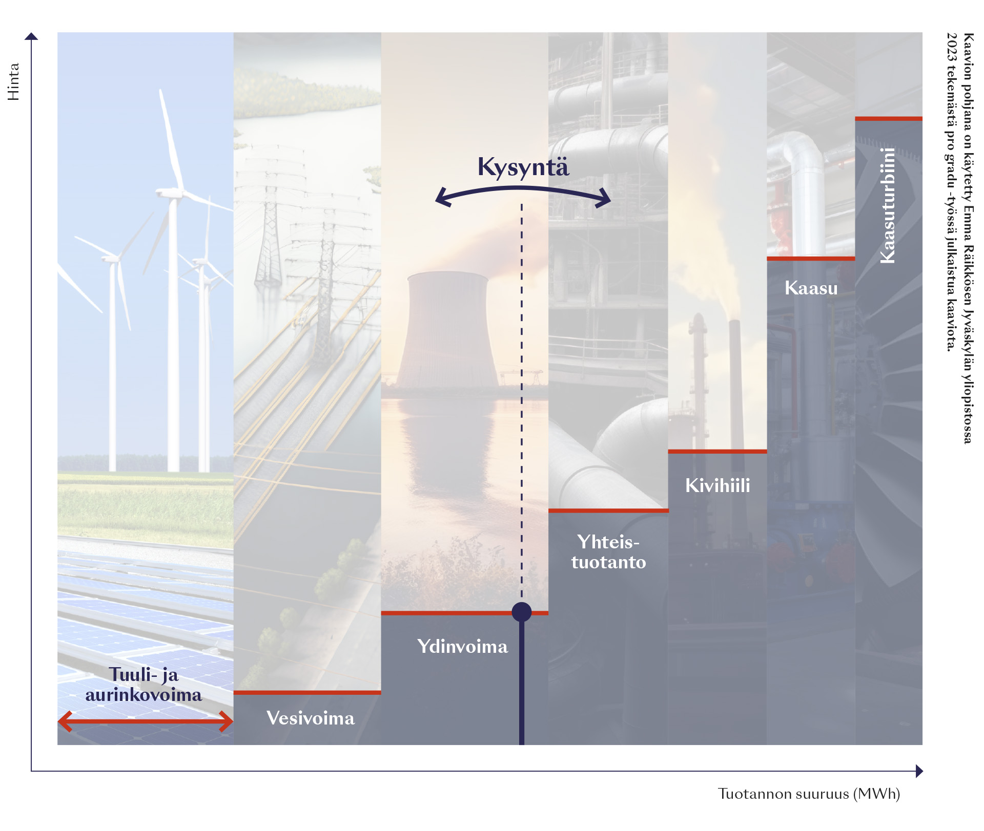 Oheinen pelkistetty kaavio kuvaa, miten kulutus jonain tiettynä hetkenä määrittelee markkinasähkön ns. spot-hinnan. Kaaviossa vapaasti kysynnän mukaan liikkuva pystyviiva sijoittuu x-akselilla sille kohdalle, missä sähkön arvioitu kulutus on seuraavana päivänä tietyllä hetkellä. Eli mitä enemmän sähköä ennakoidaan kuluvan, sitä lähempänä kaavion oikeata laitaa pystyviiva sijaitsee. X-akselilla näkyvät myös vierekkäin eri hintaiset sähkön tuotantomuodot hintajärjestyksessä, mitä korkeampi pylväs, sitä kalliimpi tuotantomuoto.